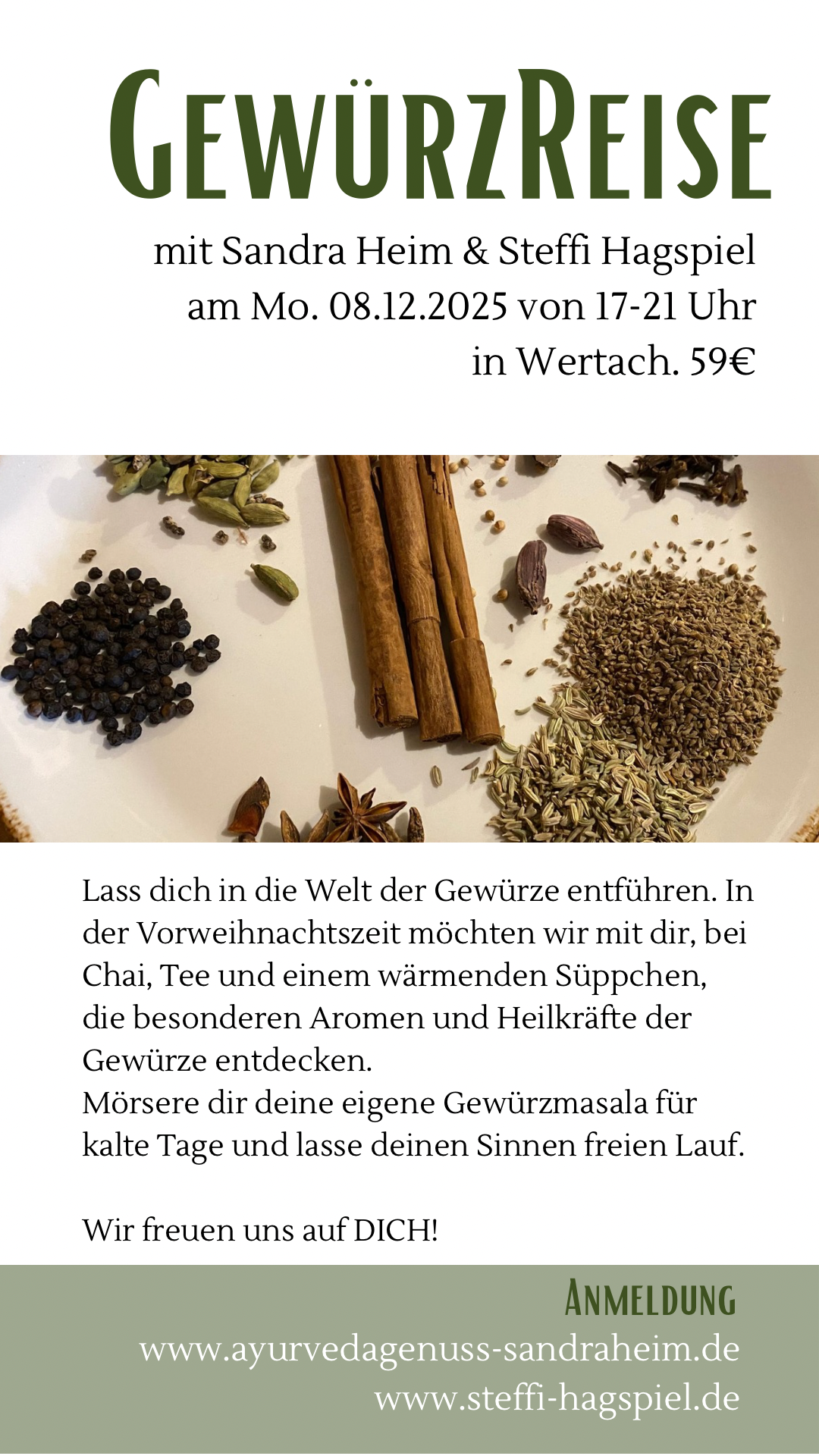 Als Ayurveda Köchin möchte ich in Kochkursen mein Wissen der Ayurveda Ernährungslehre weitergeben und mit dir gemeinsam kochen, denn Nahrung ist unsere erste Medizin.