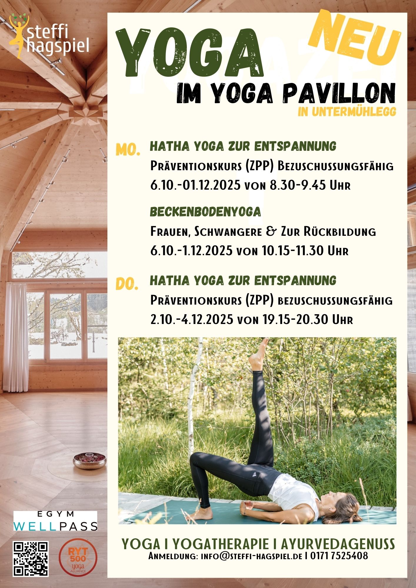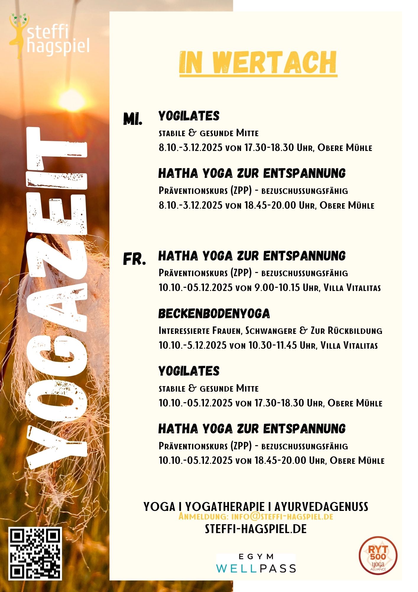 Als registrierte Yogalehrerin RYT 500 bei der Yoga Alliance, mit über 700 Stunden Kurserfahrung, inklusive 300h Ausbildung Yogatherapie, Kursleiterin für Beckenbodengesundheit, Übungsleiterin für Allroud Fitness und Ski Nordisch, verbinde ich mein ganzheitliches Denken mit Bewegung, dem Körper und als Ayurveda Köchin natürlich, mit frischer, individuell angepasst, gesunder Ernährung. Mein zertifizierter Präventionskurs „Hatha Yoga zur Entspannung“ ist von den gesetzlichen Krankenkassen bezuschussungsfähig.